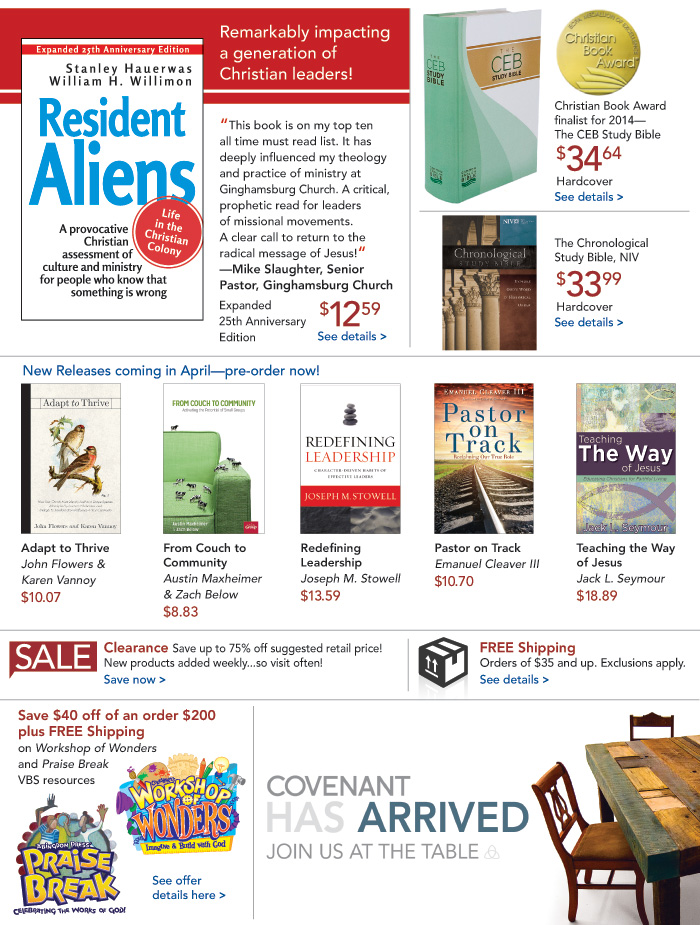 of missional movements. A clear call to return to the radical message of Jesus!" Resident Aliens Christian Book Award finalist for 2014— The Chronological New Releases coming in April—pre-order now! Adapt to Thrive From Couch to Community Redefining Leadership Pastor on Track Teaching the Way of Jesus Save $40 off of an order $200 Clearance Save up to 75% off suggested retail price! New products added weekly...so visit often! FREE Shipping on orders of $35 and up. Exclusions apply. COVENANT has arrived. |